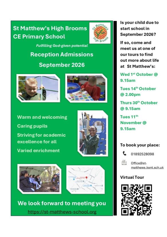 If you are thinking of applying for a place at St Matthew’s High Brooms CE Primary School for your child, feel free to contact the school office on 01892 528098 or office@st-matthews.kent.sch.uk for more information.